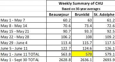 Let’s conservatively assume we finish the growing season with the 90% of the 30-year average (2636.1 CHU). That would leave us with a total of 2372.5 CHU. Which would be sufficient for early-early/mid season soybeans. Just need to hope mother nature cooperates.