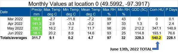 A shorter season soybean will have helped the case for anything that was late seeded. We can also be confident that the plants will get to maturity in time based on the amount of heat units we have accumulated thus far (fingers crossed we don’t have an early frost). From 30-year averages taken at the Brunkild weather station, we can typically expect 578 CHU to accumulate from May 1 to June 13th. Surprisingly, we have accumulated more CHU in the 2022 spring than many of us would have thought. Using the same weather station, we have accumulated a total of 540.2 CHU as of June 13th, which is 93% of the 30-year average.