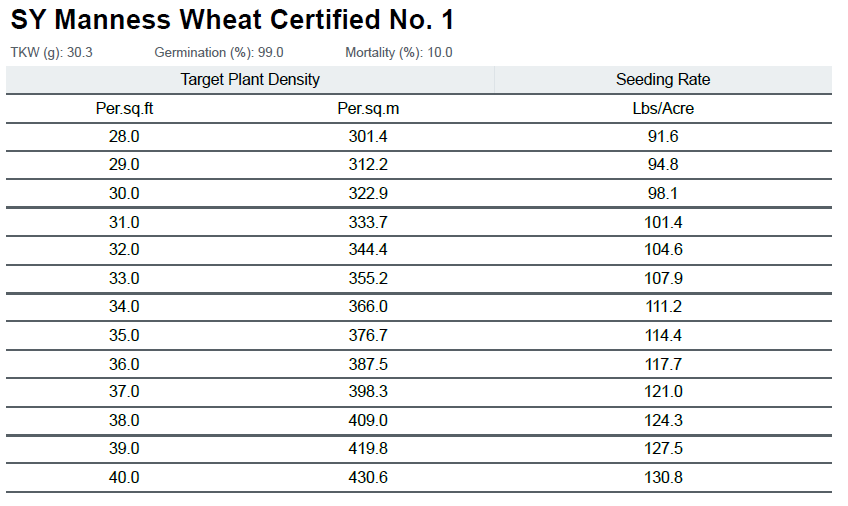 Manitoba Agriculture recommends targeting 24–28 plants per square foot for spring wheat. In the case of SY Manness, our standard 2.25 bu/ac rate puts us well above that recommendation.