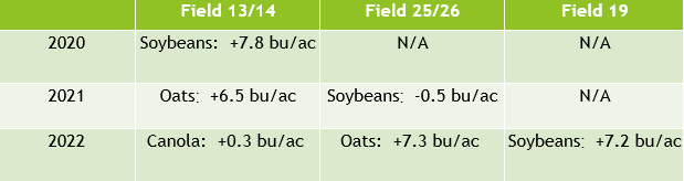 This showed in the yield, as all three fields had a bushel increase in the subsoiled areas when compared to the untreated checks. Working with Enns Brothers, we were able to scientifically pull data from our harvest maps to calculate yield gains or losses. Field 19 showed an increase of 7.2 bu/ac, field 25/16 an increase of 7.3 bu/ac and field 13/14 an increase of 0.3 bu/ac. Obviously this isn’t always the case. Last year field 25/26 had a decrease in yield of -0.5 bu/ac in the subsoiled area. Because of the drought last year, subsoiling was a detriment. However, with all of our excess moisture this year, subsoiling allowed the water to move through the soil profile faster than areas that hadn’t been subsoiled. Based on the soil probes in each of the fields, the untreated soil held on to 2 more inches of water than the subsoiled areas. This could prove to be beneficial in the 2023 growing season, depending on whether we enter into a drought again or not. For this season, we had enough moisture that being water limited was not a concern in the subsoiled areas.
